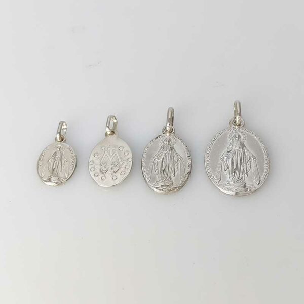 Medalla religiosa en plata de ley con anverso y reverso, disponible en varias medidas, con la imagen de la Virgen de la Milagrosa.
